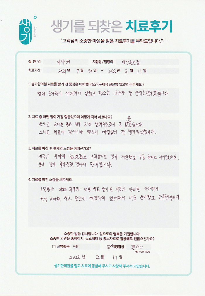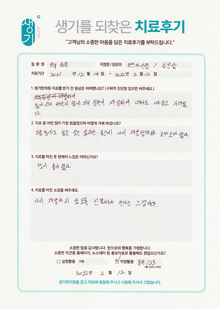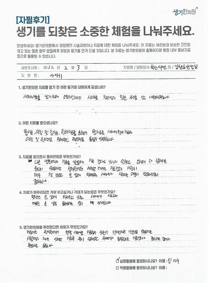 생기한의원과 함께하신 생생한 자필 및 영상 후기를 소개합니다.