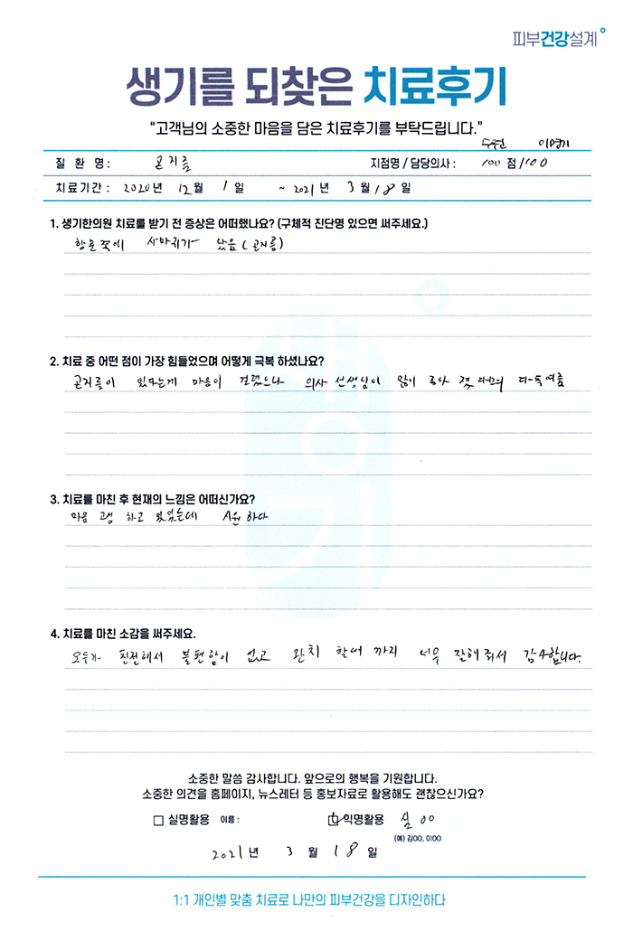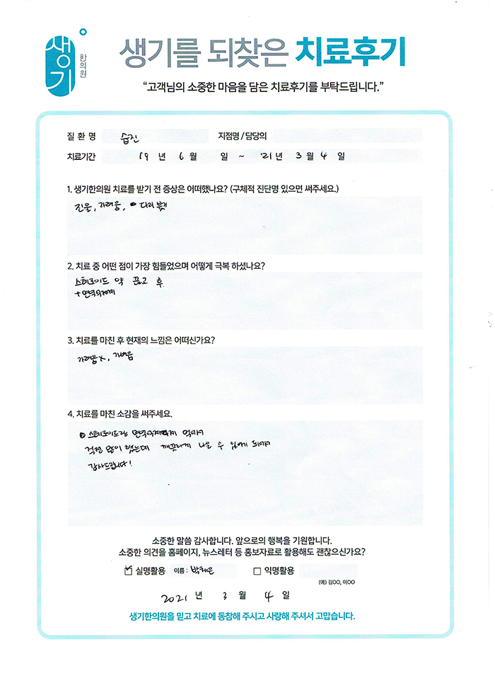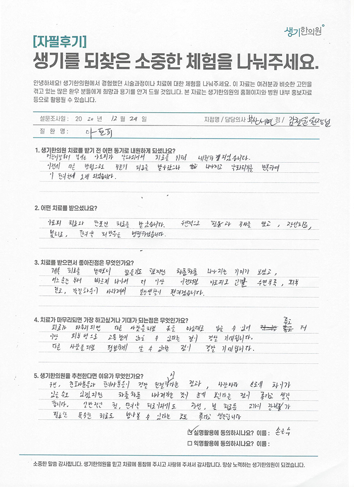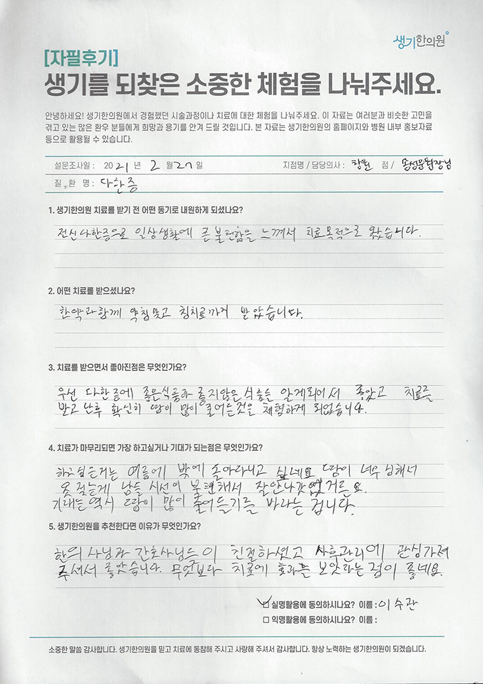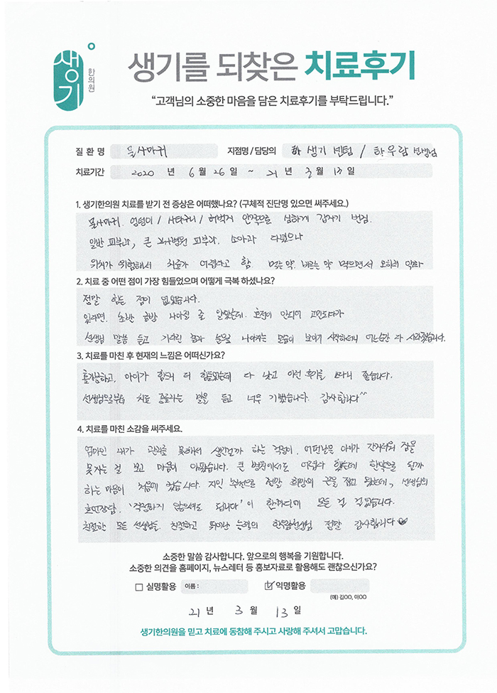 생기한의원과 함께하신 생생한 자필 및 영상 후기를 소개합니다.
