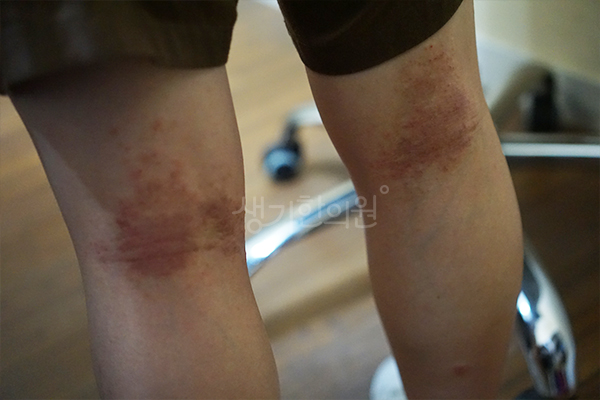 치료 중 경과 : 초기 면역반응으로 병변이 넓어지고 가려움 심해졌으나 점차 병변 두께 얇아지면서 가려움도 줄어듬