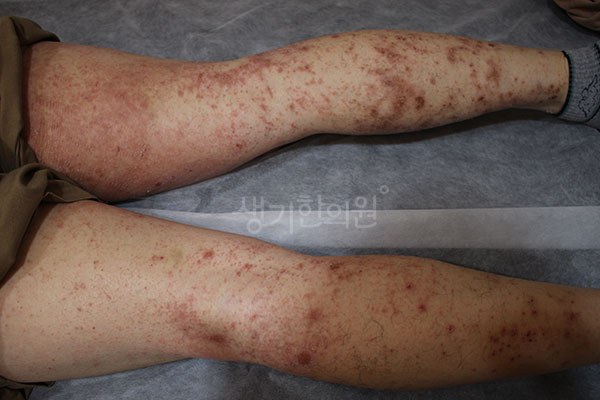 치료 중 경과 : 병변 부위 홍반 색 옅어지면서 각질 감소