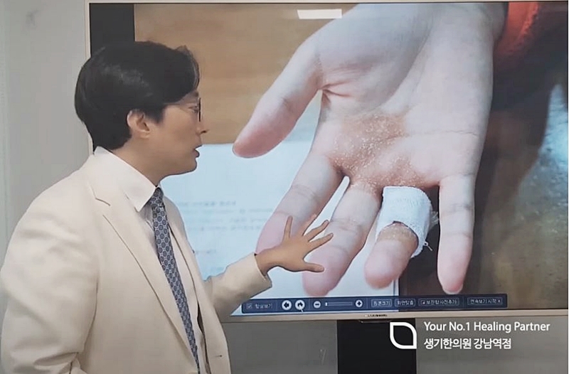 이 사진은 손에 발생한 한포진 부위에 거즈를 사용한 모습입니다.