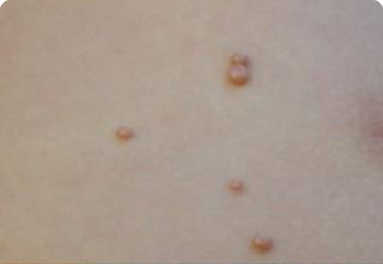 3~6mm의 반구형 모양의 수포성, 피부색 구진이 몸통, 팔, 다리, 안면 위주로 발생합니다.